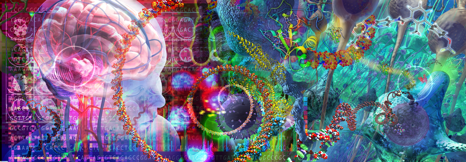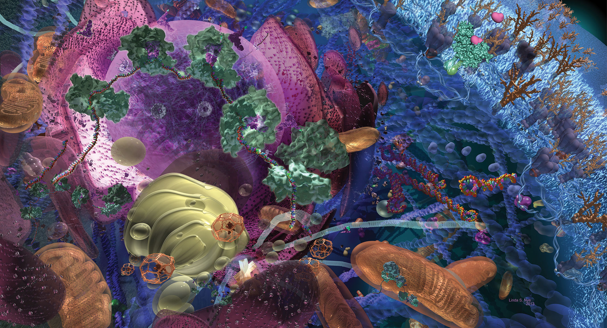 This image makes obvious the fact that life is three-dimensional even at the tiny level of the cell. The machinery of cell processes turn genes into the proteins that form our bodies. DNA is read, RNA is transcribed and translated, proteins fold and are transported inside and outside the cell. Structure is provided by chains of actin, proteins and mitochondria provide the power. Glycoproteins, carbohydrates and receptors float in the lipids that form the cell exterior and communicate with the outside world.